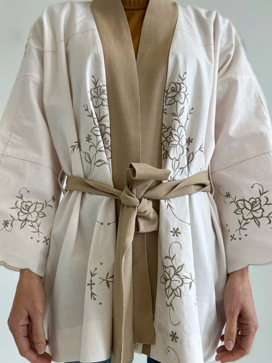 This one-of-a-kind, handmade kimono shawl is crafted from a cotton tablecloth and linen trim. Perfectly imperfect, the item has been made from a pre-loved, repurposed item.