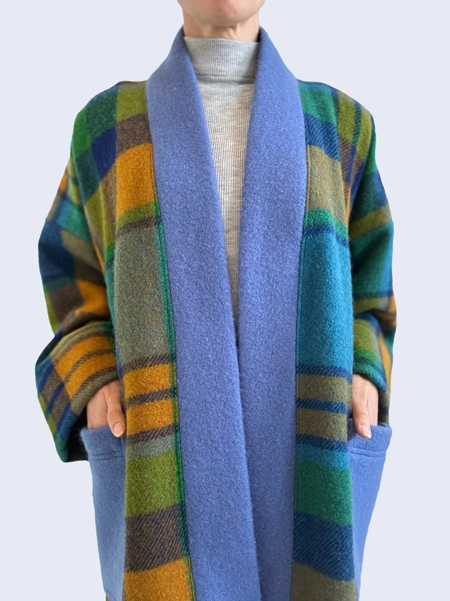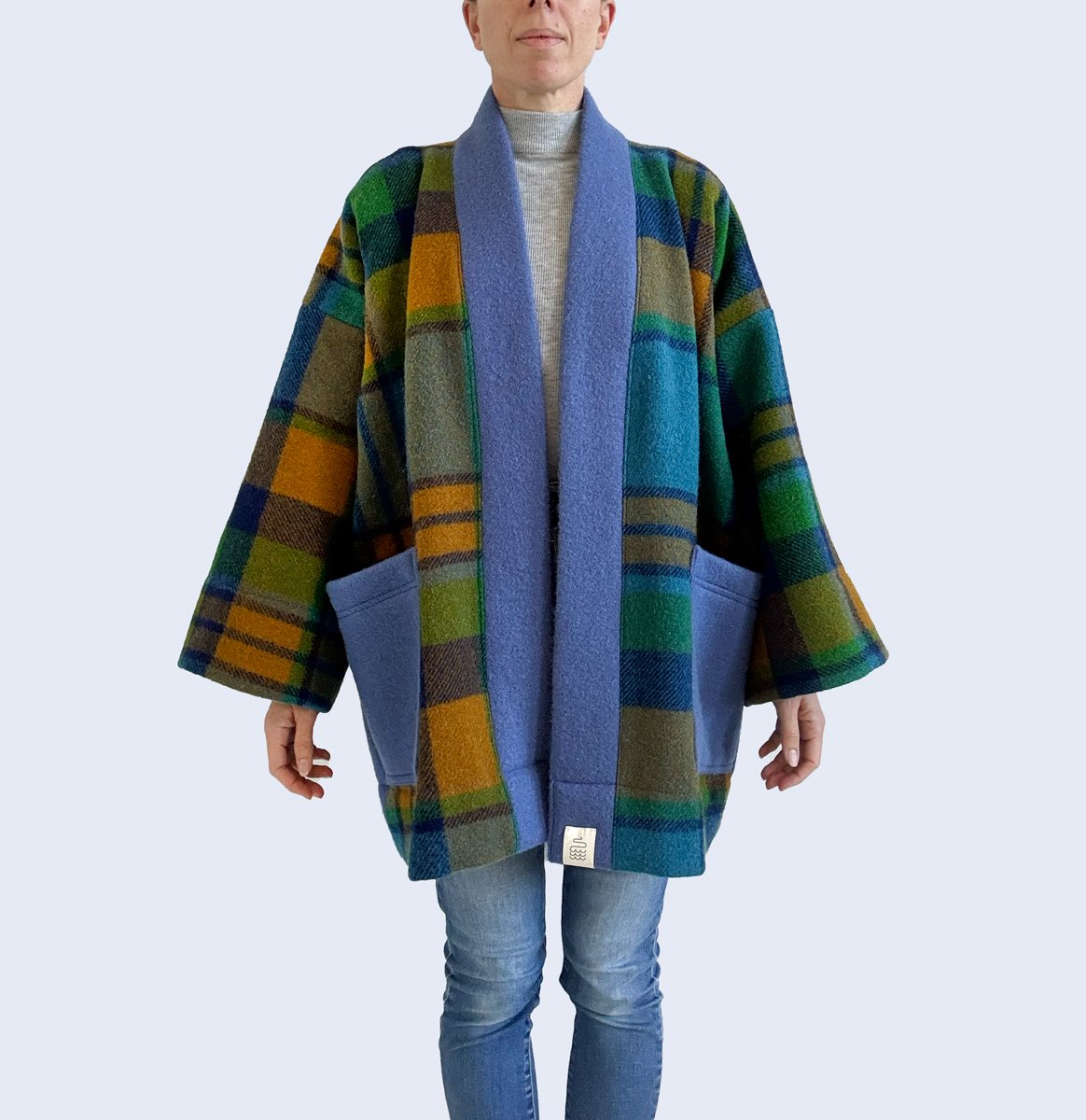 Meet Salwa – This coat is named after Jehad’s mother, a tribute to strength, warmth, and resilience. It’s thicker than my previous garments, made from the highest-quality vintage wool I’ve worked with. The colors are the most beautiful combination I’ve sewn so far. Perfectly imperfect, the item has been made from a pre-loved, repurposed item.